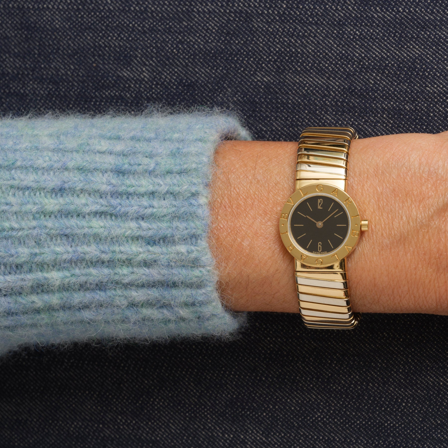 Inspired by the slinky metal coverings used to protect gasoline pipes, Bvlgari introduced their iconic (and often replicated) Tubogas style of jewelry in the mid-20th Century. Painstakingly assembled by wrapping two heated metal bands around a wooden core, the strap holds comfortably firm on the wearer, almost like an armored second skin. The process to create Tubogas not only requires the slowest and steadiest of hands, but also complete control of the temperature of the metal at all times. And since different metals begin to soften at different temperatures, that makes this piece from the 1990s an exceptional labor of love. The bracelet incorporates three different types of 18-karat gold— white, yellow, and rose — to form a gorgeous tricolor medley. The yellow gold bezel features the brand’s famous “Bvlgari-Bvlgari” design circling the dial in a sort of quasi-Cyrillic script, making for a timepiece that simultaneously leaves an impression of modern high fashion and Old-World mystique.