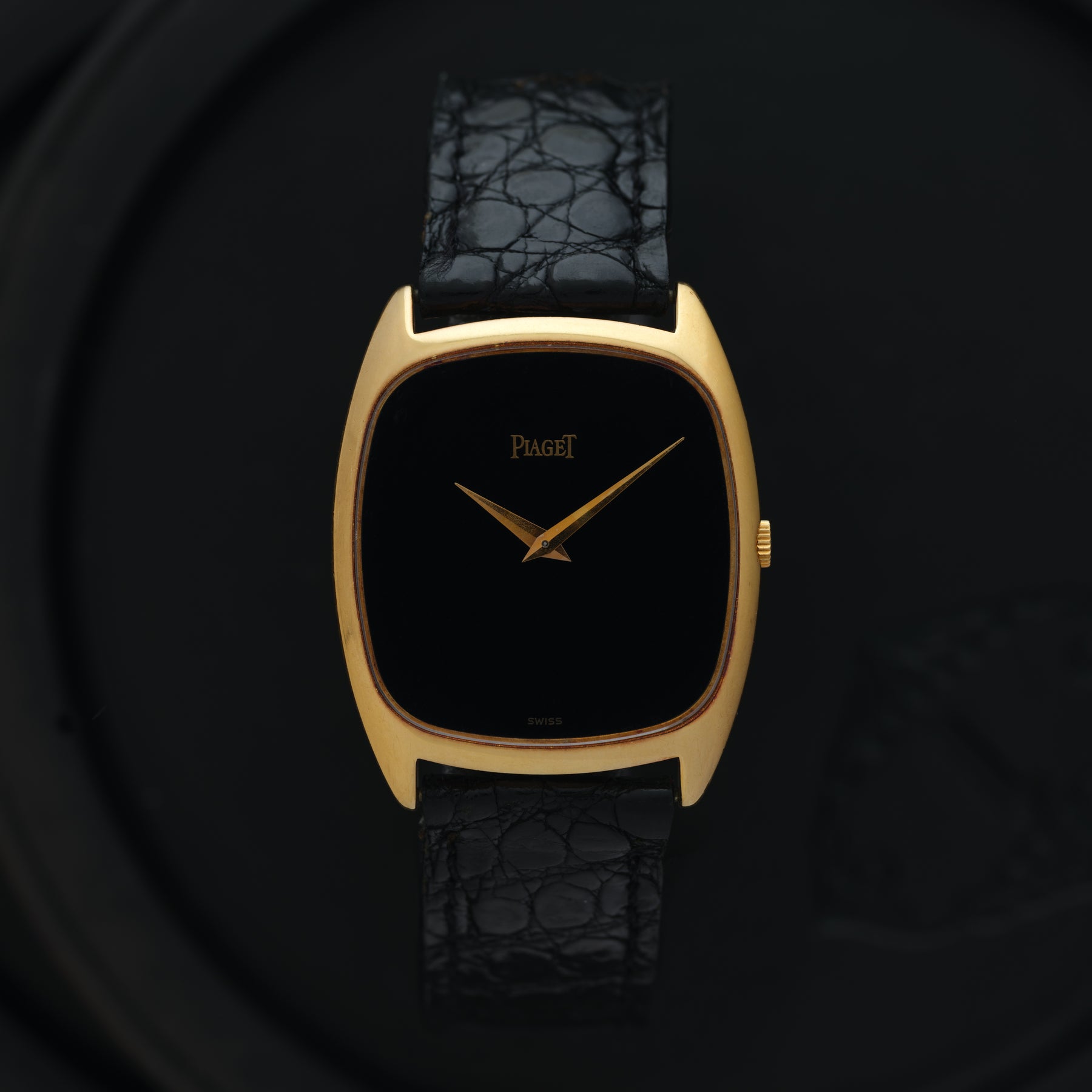 Vintage Piaget Model 9591 Emperador 18k Yellow Gold 29mm Onyx Dial, Manual Wind, on Piaget Deployment Buckle, Made in Switzerland c.1970s