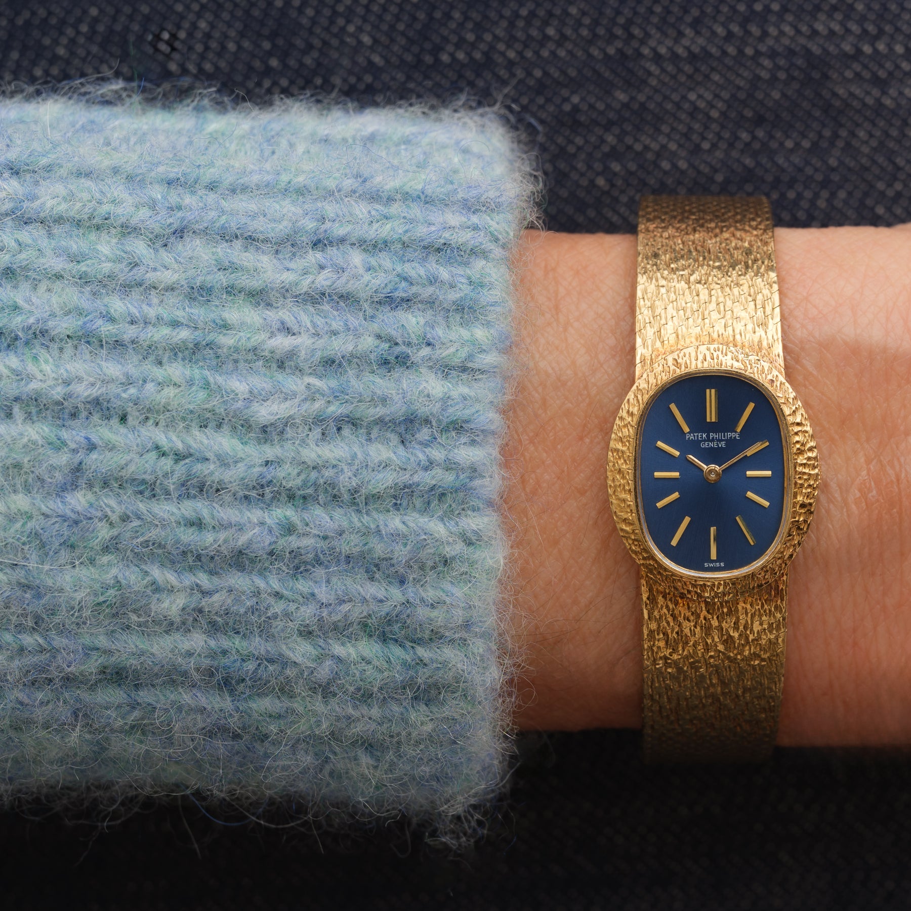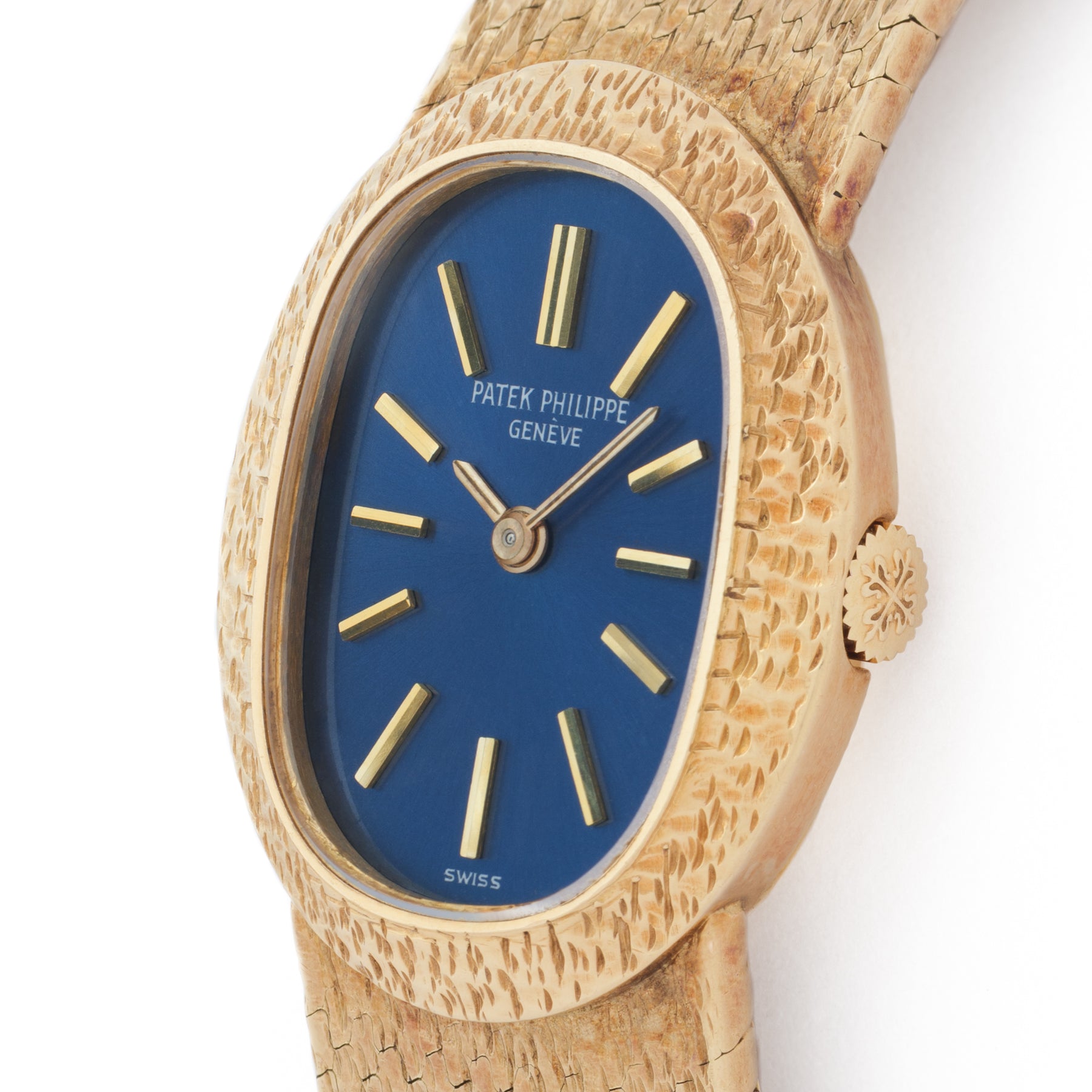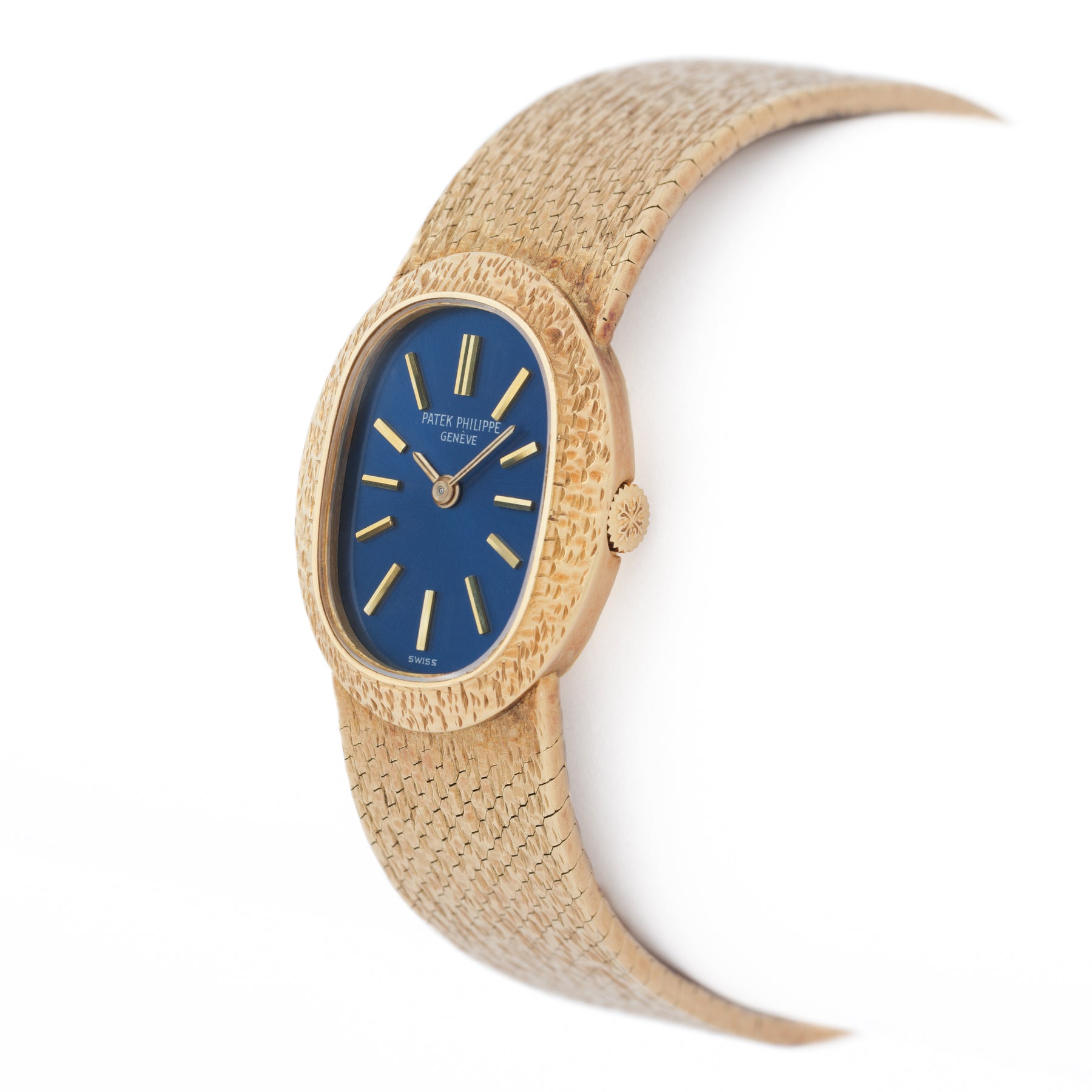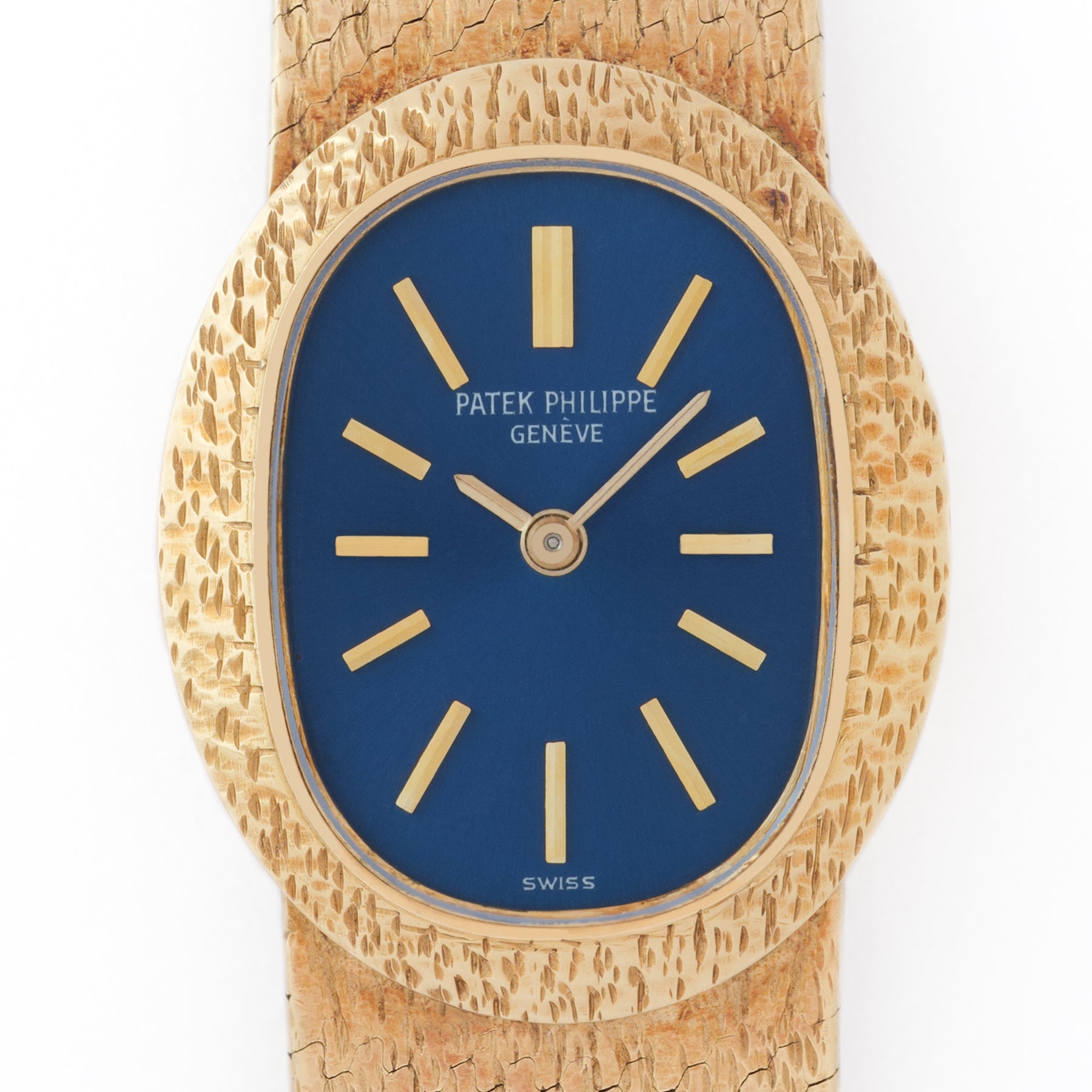 The oval case is crafted in 18k yellow gold with a finely textured finish, catching the light with a fabric-like shimmer rather than a mirror polish. The integrated bracelet continues this effect seamlessly, tapering fluidly and reinforcing the Ellipse’s sculptural continuity. The effect is striking, a single, continuous gesture of gold.